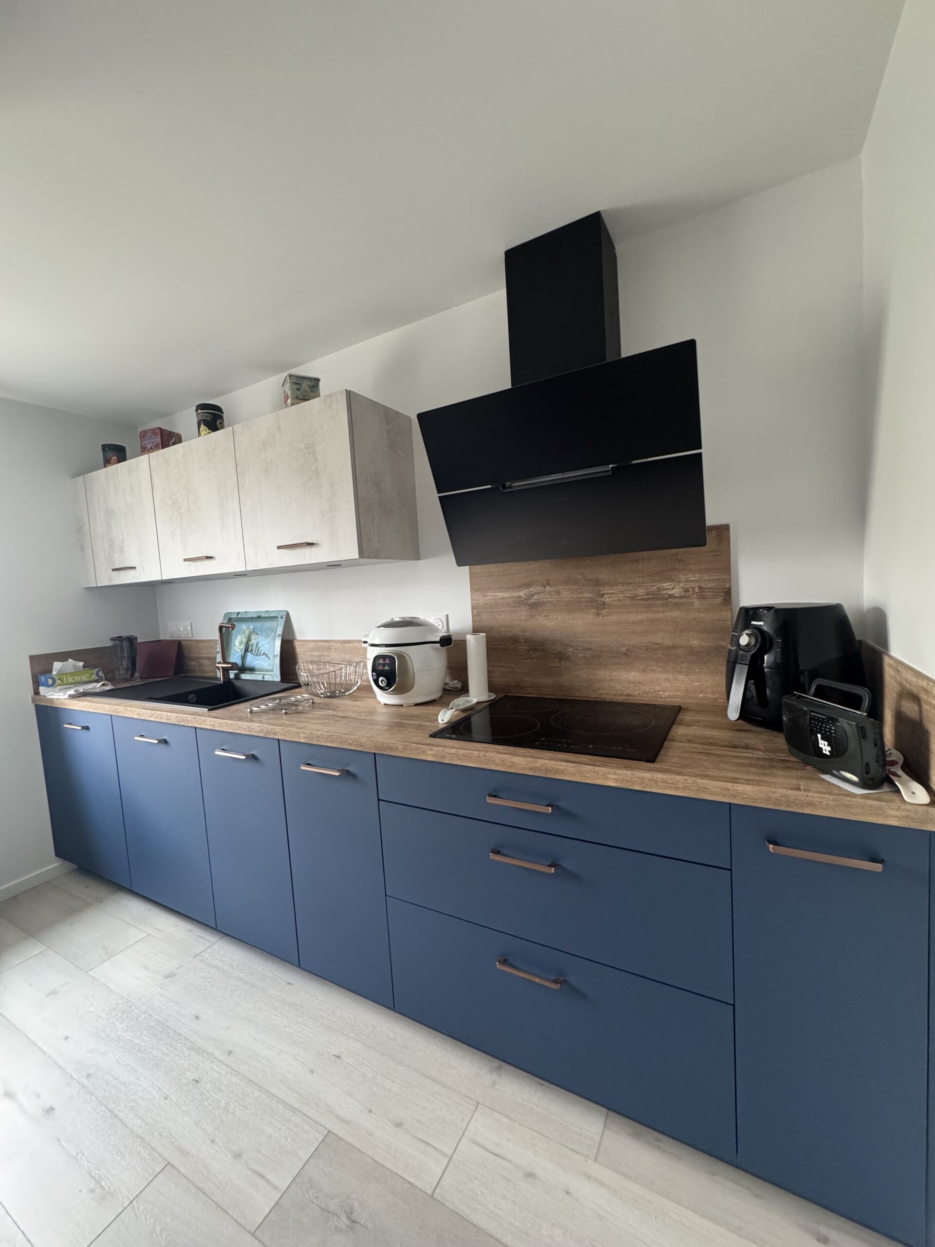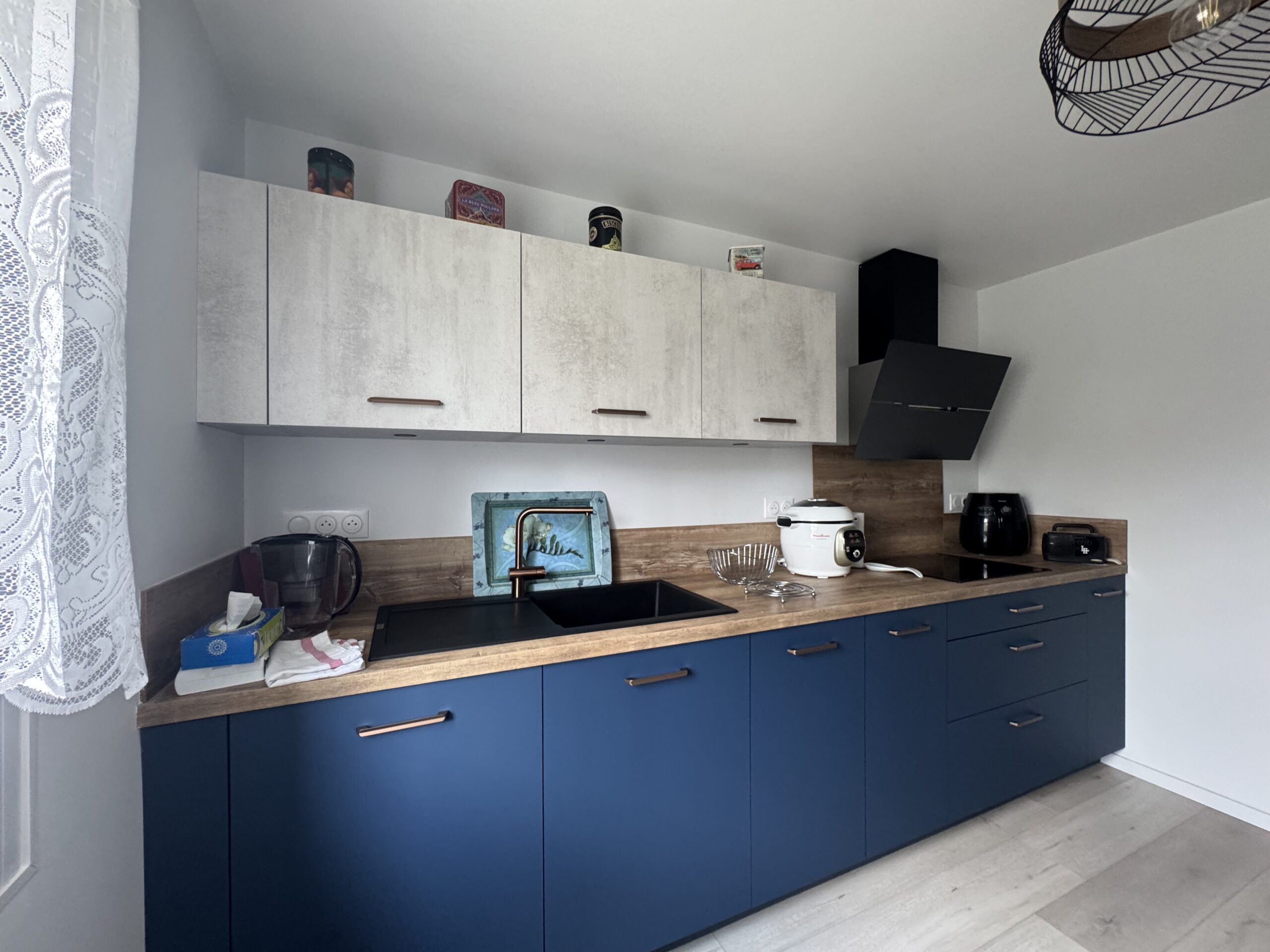 Façades bleu profond associées à une finition claire en partie haute, plan de travail effet bois chaleureux, électroménager parfaitement intégré…